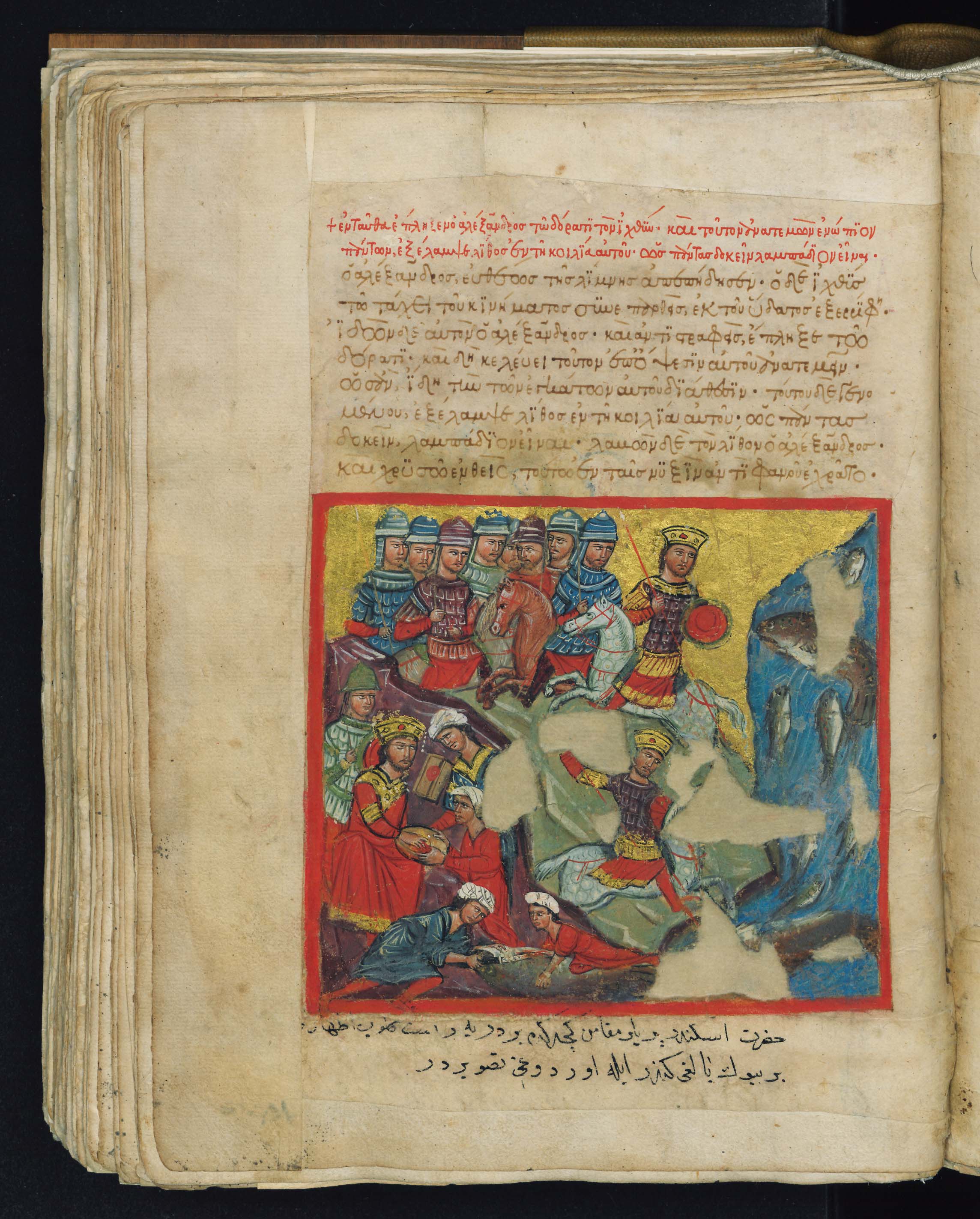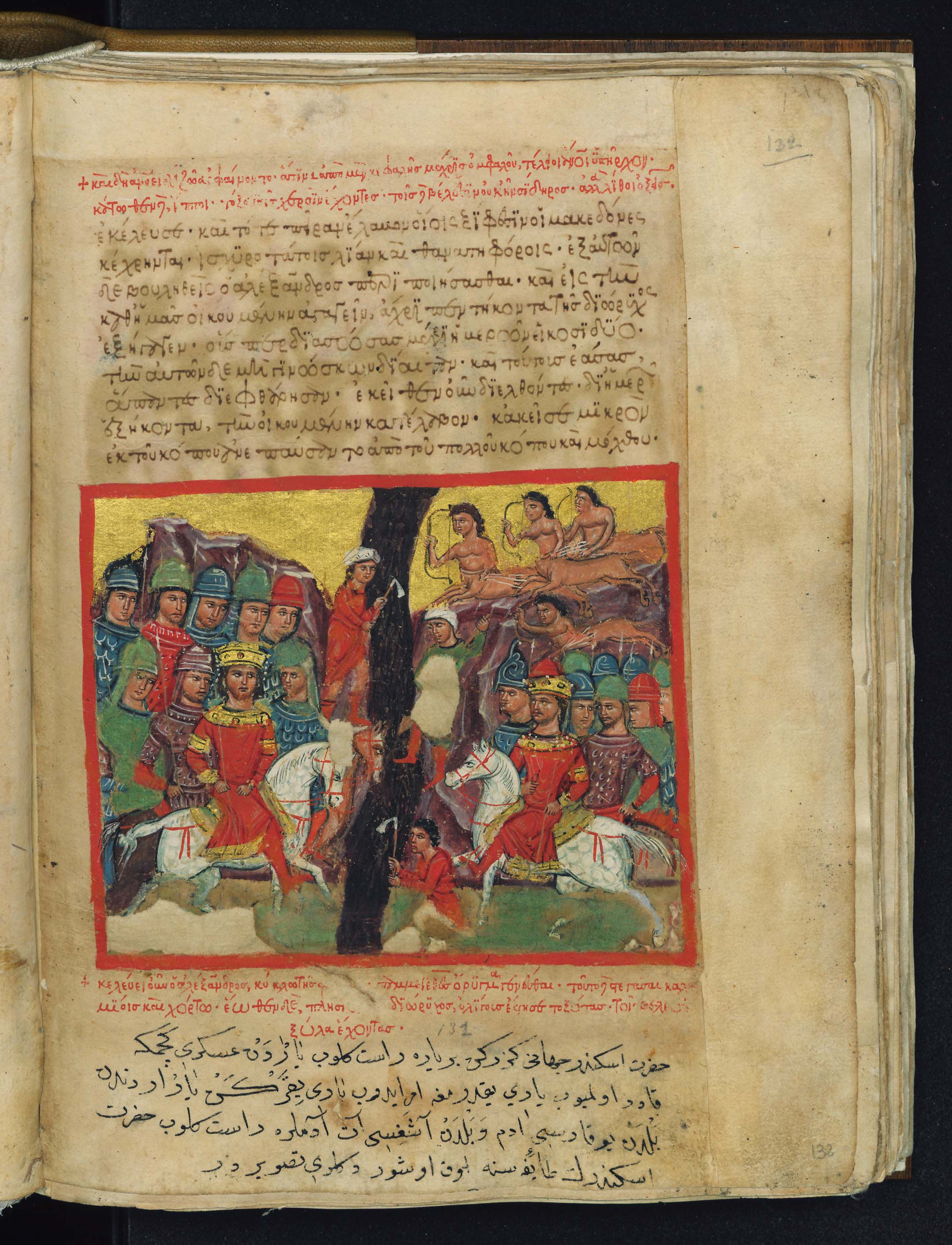 Και ως ήκουσεν ο Αλέξανδρος πως ανέζησαν τα οψάρια, εθαύμασε και εξεπλάγη. Και όρισε και εκολύμβησαν όλα τα φουσάτα του με τα άλογα τους μέσα εις την λίμνην και εδυναμώθησαν από τον κόπον τον πολύν. Και απ' αυτού επεριπάτησεν ημέρας δύο και ήλθεν εις άλλην λίμνην, οπού είχε το νερόν γλυκύ ωσάν ζάχαρη. Και εσέβη ο Αλέξανδρος να κολυμβήσει και ήλθεν επάνω του ένα οψάρι μέγα. Και αυτός έφυγεν έξω και το οψάριον κυνηγώντας τον εξέβη έξω. Και αυτός το εκαβαλίκευσε και εσκότωσέ το. Και είπε και έσχισάν το και ευρήκεν μέσα του ένα λιθάρι πολύτιμον· και ήτον ωσάν χηνάριον αυγό και έλαμπεν ώσπερ τον ήλιον. Και όρισε και έβαλάν το εις το φλάμπουρόν του και εβαστούσαν το εις τον Αλέξανδρον ομπροστά ωσάν φανάρι. Και απ' εκεί ήλθαν εις άλλην λίμνην και έπεσαν να αναπαυθούν. Και όταν εβραδίασεν εξέβησαν από εκείνην την λίμνην γυναίκες και έλεγαν τραγούδια πολλά εύμορφα, εις τόσον οπού ο νους του ανθρώπου επαίρνετο. Και ως ομοιάζει, εκείνες ήτον οι αναράιδες, οπού λέγουν την σήμερον. Και απ' αυτού επεριπάτησαν ημέρας εξ και ήλθον εις έναν τόπον οπού ήτον λόγκος μέγας. Και εκεί εξέβησαν αλογάνθρωποι πολλοί κατεπάνω του φουσάτου, οι οποίοι από την μέσην και απάνω ήτον άνθρωποι, από δε την μέσην και κάτω ήτον άλογα. Και ήτον όλοι τοξότες και το ξιφάρι της σαΐτας ήτον από λίθον αδαμάντινον. Και σίδερον δεν είχαν παντελώς και ήτον πολλά ογλήγοροι ωσάν πετούμενα. Και ως τους είδεν ο Αλέξανδρος, είπε των Μακεδόνων: Ας κάμομεν μίαν πονηρίαν, να πιάσομεν απ' αυτούς να τους πάρομεν εις την Μακεδονίαν δια θαύμα. Και επρόσταξε να κάμουν λάκκους, να τους σκεπάσουν με καλάμι χοντρό. Και απέστειλεν ανθρώπους να τους παρακινήσουν εις πόλεμον, και αυτοί μην ηξεύροντες την πονηρίαν των ανθρώπων έπεσαν εις τους λάκκους. Και εσκότωσαν δώδεκα χιλιάδες και επήραν και ζωντανούς και τους ημέρωσαν άλλες έξι χιλιάδες. Και ηθέλησαν να τους εβγάλουν εις τον κόσμον. Και τόσον ήτον ογλήγοροι, ότι δεν τους εγλίτωνε τίποτας. Και όπου και αν ετόξευαν, δεν αστοχούσαν. Και τους έδωκεν ολωνών άρματα ο Αλέξανδρος και τους ετοίμαζεν, διά να τους έχει βοηθούς εις τους ερχόμενους πολέμους. Οπόταν δε εξέβησαν εις τον κόσμον, κατά τύχην εφύσησεν άνεμος κρύος και απόθαναν όλοι. Μετά δε εξήντα ημέρας ήλθαν εις την Ηλιούπολιν και εσέβηκαν εις ένα ναόν και επροσκύνησαν εις τον οποίον ευρήκεν ο Αλέξανδρος γράμματα οπού έδειχναν τον θάνατον του και ελυπήθη πολλά. Και απ' αυτού εσηκώθησαν και επεριπάτησαν ημέρας δέκα. Και ηύραν ανθρώπους μονοπόδαρους και είχαν ουράν ωσάν πρόβατα. Και επίασαν πολλούς απ' αυτούς και ήφεράν τους εις τον Αλέξανδρον. Και ο Αλέξανδρος τους ερώτησε λέγων: Πώς είστε αυτού; Και αυτοί του είπαν: Αλέξανδρε βασιλεύ, ελεημονήσου και άφες μας, ότι διά αδυναμίαν μας ήλθαμεν εδώ και εκρύφθημεν. Και ακούοντας ταύτα τα λόγια ο Αλέξανδρος τους άφησε διά να πηγαίνουν. Και επηδούσαν από λιθάρι εις λιθάρι και άρχισαν να περιγελούν τον Αλέξανδρον και έλεγαν: Ο Αλέξανδρος όλον τον κόσμον επήρε τον με την φρονιμάδα του και ημείς τον εγελάσαμεν και μας άφηκεν, οπού το κρέας μας είναι νοστιμότερον από όλα τα πετούμενα και τετράποδα και το κουφάρι μας γέμει πολύτιμα λιθαρόπουλα και χοντρό μαργαριτάρι και το πετζί μας σίδερον δεν το απερνά. Και ως ήκουσεν ο Αλέξανδρος, εγέλασεν και είπε: Ο άνθρωπος από την γλώσσαν του χάνει το κεφάλι του. Και ευθύς όρισε και αρματώθηκαν διακόσιες χιλιάδες καβαλαραίοι 