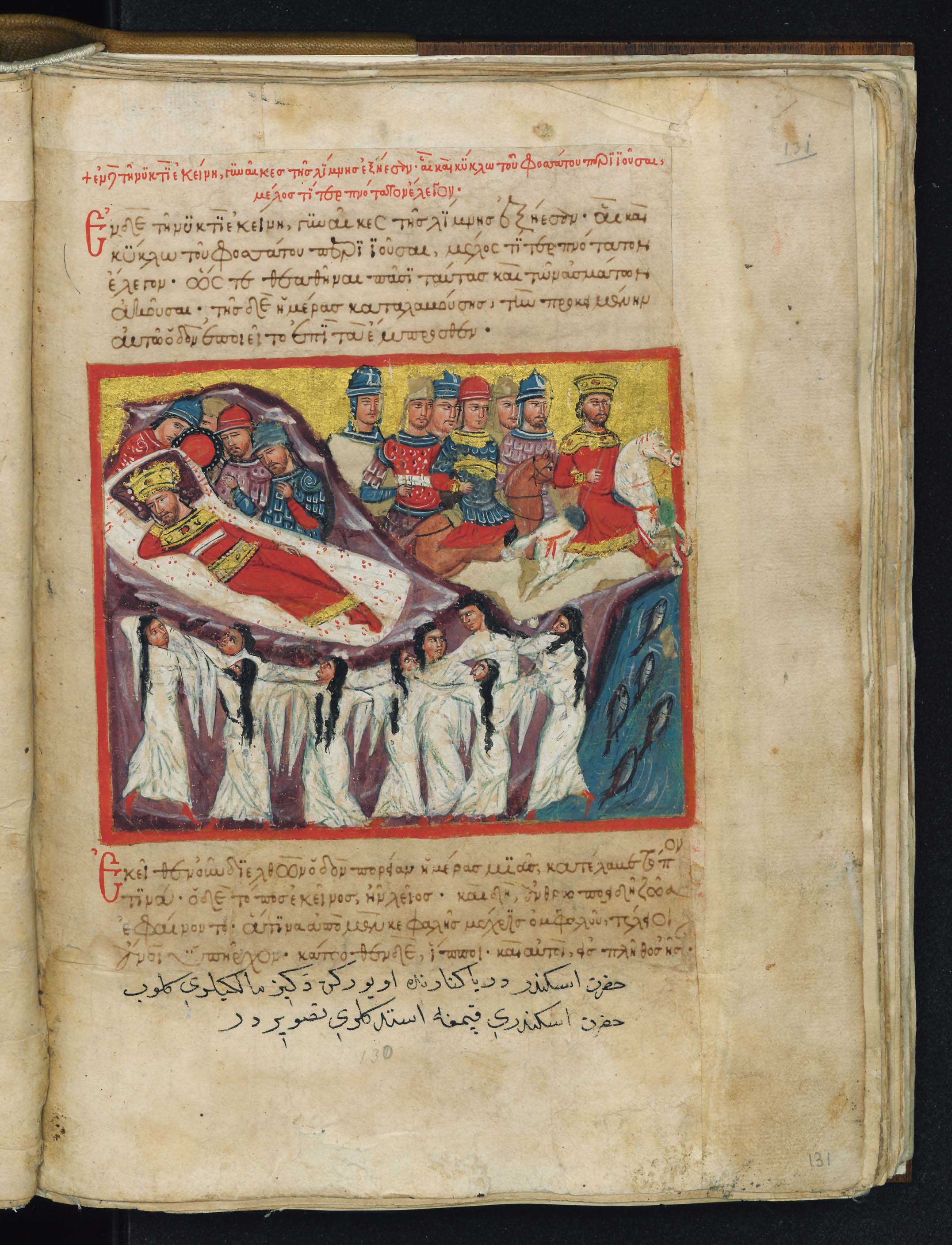 Μισεύοντας δε από το νησί των Μακάρων επερπατούσαν ημέρες δέκα. Και ηύραν έναν κάμπον πλατύν και μέγαν και εις την μέσην του ήτον ένα χάος βαθύ και πλατύ, οπού εκρατούσεν από μίαν άκραν έως την άλλην, και δεν ημπορούσαν να απεράσουν. Και επρόσταξεν ο Αλέξανδρος και έκαμεν ένα γεφύρι πολλά μεγάλον και εδιάβηκεν με τα φουσάτα του, εις την μέσην δε του γεφυριού έγραψεν τα παρόντα γράμματα: «Διά προσταγής Αλεξάνδρου του βασιλέως εκτίσθη το παρόν, και εδιάβη με τα φουσάτα του, όντας εξήλθεν εκ της γης των Μακάρων».