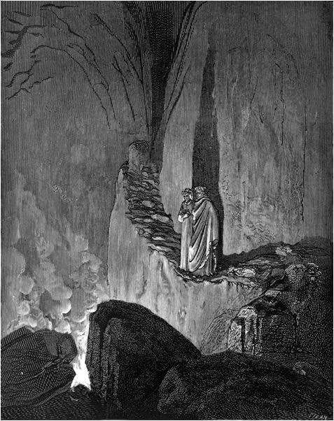Στο 26ο άσμα της Κόλασης ο Δάντης διηγείται ότι, όταν έφτασαν, με οδηγό το Βιργίλιο, στον 8ο Κύκλο, συνάντησαν εκεί τις ψυχές του Διομήδη και του Οδυσσέα τυλιγμένες στις φλόγες. Ο Δάντης θέλησε να τους μιλήσει, αλλά τον συγκράτησε ο Βιργίλιος λέγοντάς του: