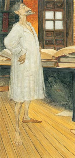 Και το έδωσε στον αφεντικό του, ο οποίος αμέσως το φόρεσε, σαν καπέλο, κι άρχισε να το γυρίζει απ' όλες τις μεριές, γυρεύοντας να το εφαρμόσει στο κεφάλι του κι επειδή δεν μπορούσε να το καταφέρει, είπε: